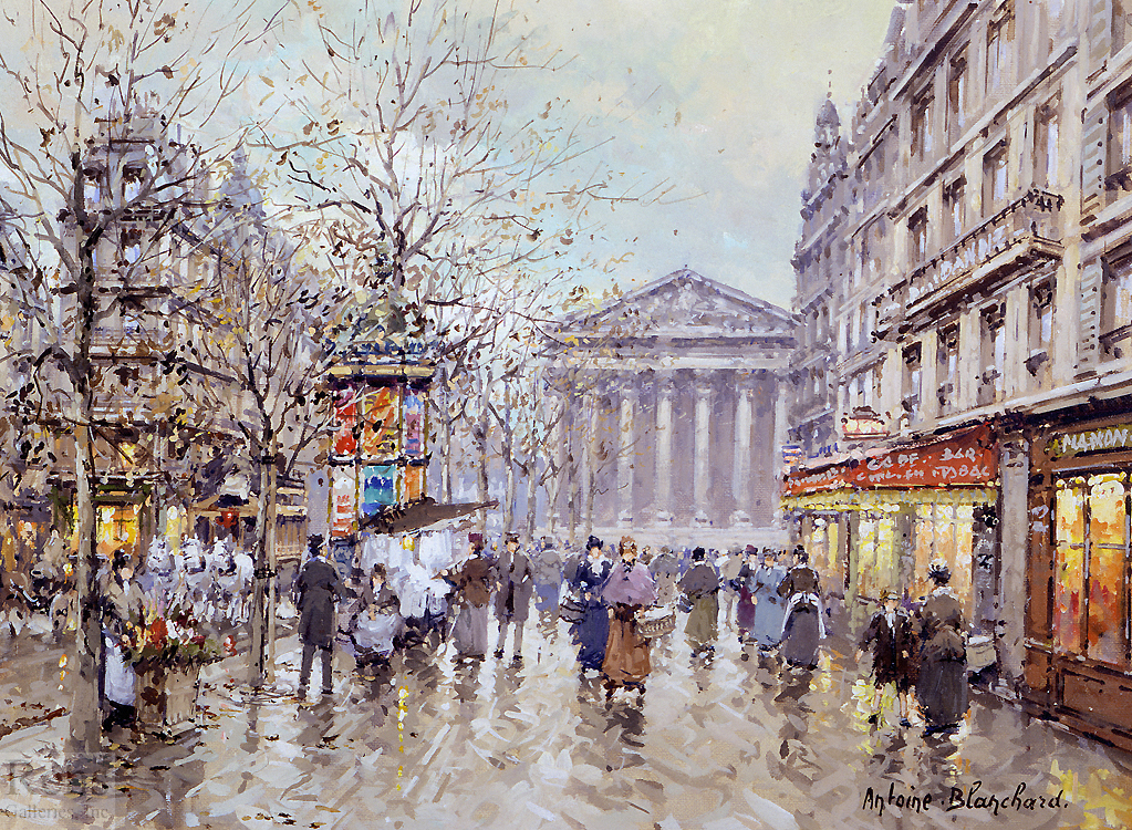 Larde continues to write that his works are first of all, a marvelous invitation to an ideal walk through old Paris, so different from that of to-day. Although a large number of historical monuments remain, today's Paris has little in common with Paris at the turn of the century; the scenery may be almost the same, but daily life as it characters has totally changed; the customs have been entirely transformed. In his paintings, Antoine Blanchard invites us to relive this period by showing us pleasant strolls along embankments, squares and boulevards at a period in Parisian life when time did not count, when one had all one's time to idle, to stroll along the streets, to window-shop, to walk quietly along the boulevards or spend the afternoon in a sidewalk café.